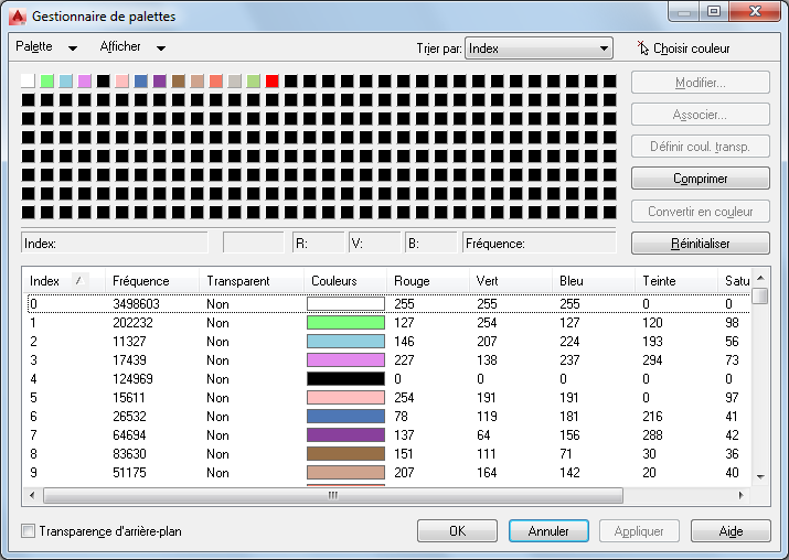 Remarque : La colonne Fréquence de la table a changé : la fréquence de toutes les couleurs, sauf celles d'indices 0 et 8, est à présent définie sur 0.