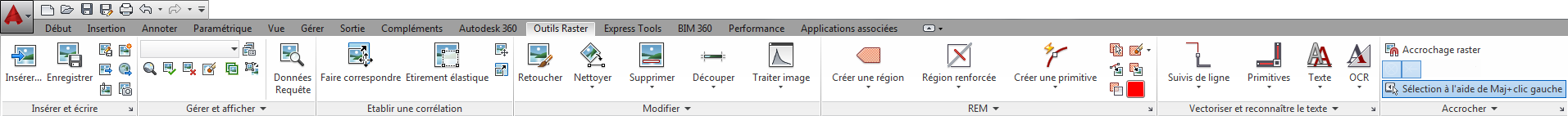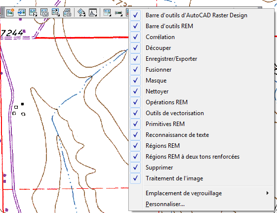 Barre d'outils AutoCAD Raster Design Toolset avec affichage d'un sous-menu ouvert et d'une info-bulle