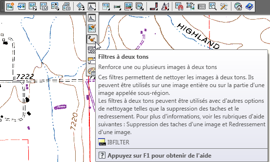 AutoCAD Raster Design toolset propose plus d'une dizaine de barres d'outils offrant un accès direct à de nombreuses options. La barre d'outils AutoCAD Raster Design est la plus volumineuse. Elle inclut plusieurs sous-menus, que vous pouvez afficher sous forme de barres d'outils distinctes. Lorsque vous passez le pointeur de la souris sur une icône d'outil, une info-bulle apparaît, indiquant le nom de l'outil. Des informations plus détaillées sur l'outil, telles que la commande équivalente que vous pouvez taper sur la ligne de commande, apparaissent dans la barre d'état AutoCAD en bas de l'écran.