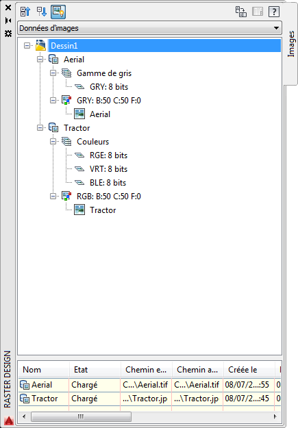 La fenêtre d’outils Gestionnaire des images affiche la structure des données d’images associées à un dessin. Les options de cette boîte de dialogue permettent de manipuler les fichiers image, de modifier l'ordre d'affichage des images ou leur chemin d'accès actif, de modifier des palettes de couleurs et d'exporter des images à d'autres emplacements.