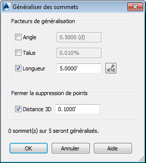 La figure 16 illustre la boîte de dialogue de configuration de l'opération de généralisation. Vous pouvez indiquer les facteurs de généralisation à appliquer, ajuster les valeurs numériques et prévisualiser les résultats avant la validation. Cliquez sur le bouton Aide de cette boîte de dialogue pour consulter la rubrique d'aide relative à la généralisation et à l'utilisation optimale de ces éléments.