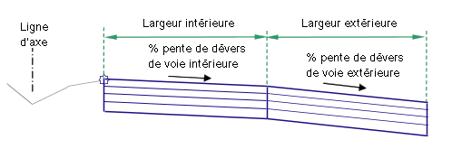 Cet élément de profil type crée un jeu de voies intérieures et de voies extérieures qui peuvent avoir différentes pentes. Les voies intérieures sont insérées vers l'extérieur à partir du point d'association à l'aide de la pente de dévers de la voie intérieure. Si le dévers n'est pas défini sur une abscisse curviligne, la valeur Pente par défaut intérieure est utilisée. Les voies extérieures sont insérées vers l'extérieur à partir de l'extrémité des voies intérieures, à l'aide de la pente de dévers de la voie extérieure, ou la valeur Pente par défaut extérieure.