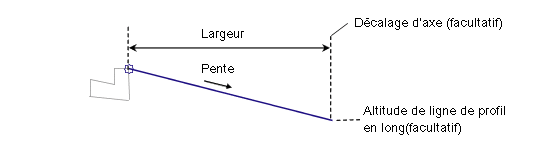 Une valeur de pente en % ou sous forme de rapport peut être spécifiée. Un axe ou une ligne de profil en long peut être utilisé(e) lors de la construction d'un modèle de projet 3D pour autoriser des largeurs et des pentes variables.