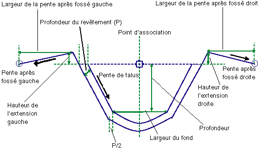 Si la largeur de la pente après fossé est omise, le point marqué se situe au niveau du point extérieur de l'extension de la hauteur de caniveau. Si le lien d'extension de hauteur du caniveau est également omis, alors le point marqué se situe au niveau du point le plus à l'extérieur de la partie supérieure du caniveau.