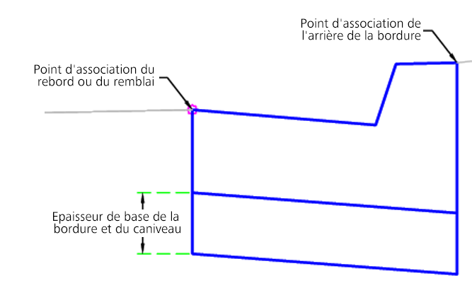 Le point initial est défini sur le point d'association. Les points, les liens et les formes de la bordure et du caniveau sont générés en fonction du type de bordure sélectionné. La base est ensuite placée sous la bordure et sous le caniveau.