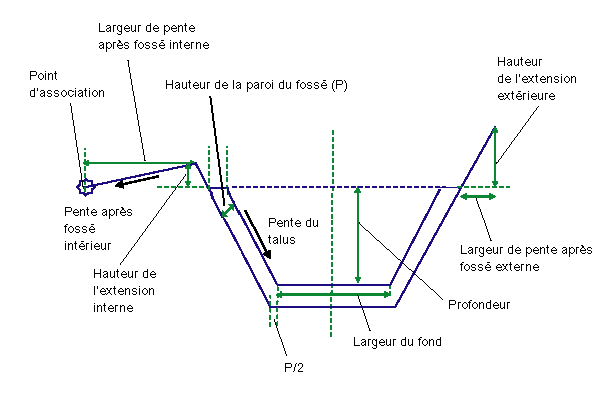 | Largeur de pente après fossé interne | Largeur du remblai du fossé sur la paroi intérieure | Numérique, positive |