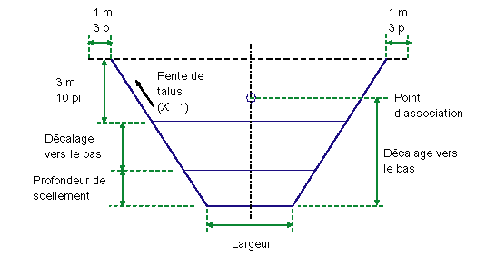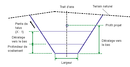 L'altitude du fond du fossé est calculée selon l'altitude du profil projet diminuée de la valeur de Décalage vers le bas. Le lien du fond du fossé horizontal est placé symétriquement par rapport au décalage du point d'association à cette altitude. Les pentes du talus sont prolongées vers le haut jusqu'à la surface existante. Le lien de scellement horizontal est placé à la profondeur spécifiée au-dessus du fond du fossé. Le lien de Remblai spécial horizontal est placé à la profondeur spécifiée au-dessus du lien de remblai spécial.