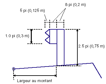Une structure de rambarde peut être appliquée aux lignes de profil en travers en remblai qui répondent aux critères d'utilisation de la pente abrupte de remblai. Si ces critères sont remplis (Largeur de la rambarde non nulle et paramètre Inclure la rambarde défini sur True), la structure de rambarde est dessinée sur l'abscisse curviligne. Les cotes de la structure de rambarde sont fixes comme dans le diagramme ci-dessous.