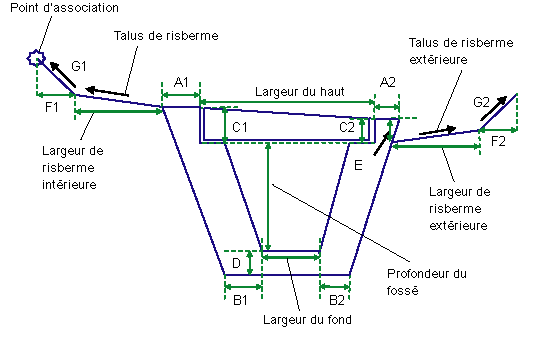 Le point d'association est le point le plus profond sur les liens de talus précédant la structure de fossé. Si les liens de talus sont omis sur l'intérieur, alors le point d'association est sur le point le plus profond de la paroi intérieure.
