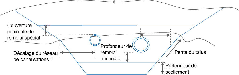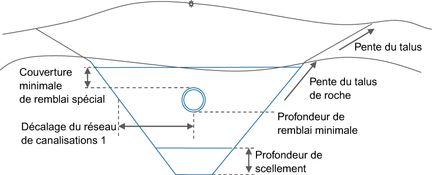 | Profondeur minimale du remblai spécial | Profondeur minimale du remblai spécial en dessous de la canalisation la plus basse. La canalisation est mesurée en fonction de son diamètre extérieur le plus bas. | Numérique, positive | 0.0 |