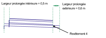 Dans l'exemple suivant, la largeur prolongée intérieure de Revêtement4 est 0.5 mètres. La largeur prolongée extérieure de Revêtement4 est de 0.6 mètre. Si cet élément de profil type est inséré sur le côté droit, il est dessiné comme indiqué sur l'illustration suivante.