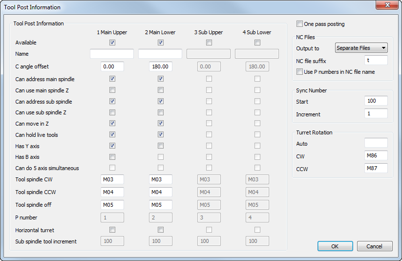 Select the CNC-Info > Tool Posts menu option to configure the tool posts. The Tool Post Information dialog is displayed.