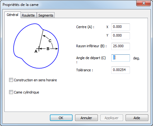 L'onglet Général contient des options qui définissent les dimensions de base sur lesquelles les attributs spécifiques de la came sont basés.