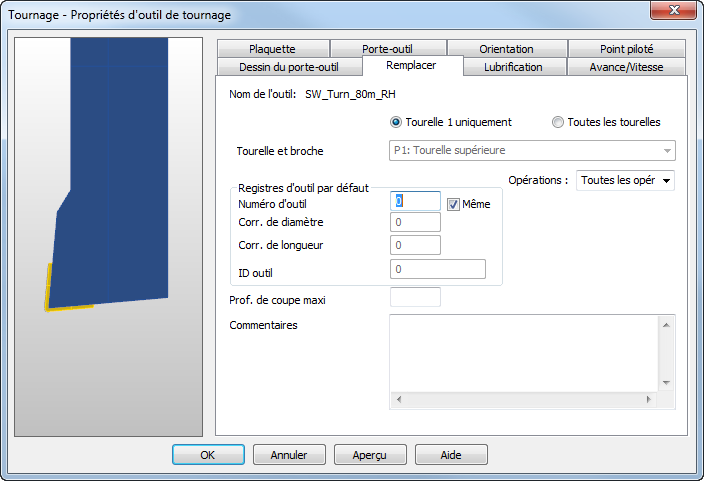 Commentaires — Entrez éventuellement un commentaire associé à l'outil. Un post-processeur peut être configuré pour extraire ces commentaires.
