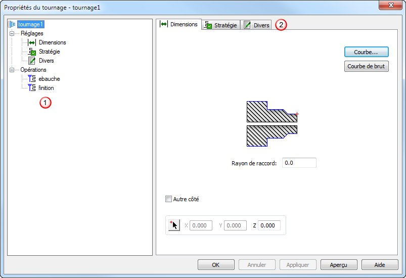 L'onglet de feature de tournage liste les différentes opérations pour la feature :