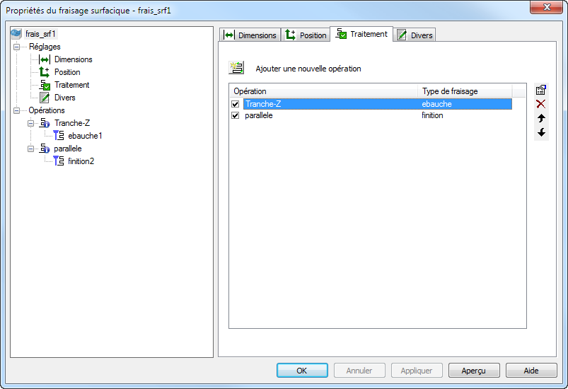 L'onglet Traitement liste les opération qui sont inclues pour le fraisage de la feature dans l'ordre dans lequel elles se produisent. Vous pouvez retirer des opérations en les sélectionnant. Cela vous permet de personnaliser les opérations et d'ensuite les désactiver pour réduire la surcharge à l'écran quand vous travaillez sur les opérations venant après.