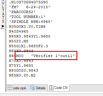 Cliquez sur le bouton Appliquer, puis sur le bouton OK et le code CN et le commentaire sont ajoutés à l'onglet Parcours d'outil dans la rangée au-dessus de la rangée sélectionnée, par exemple :