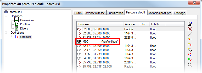 Par exemple, vous pouvez entrer un arrêt conditionnel M00 à un point en particulier pour vérifier l'outil.