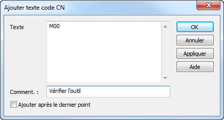 Cette boite de dialogue vous permet d'insérer une ou plusieurs lignes de code CN avant le point sélectionné et éventuellement ajouter un commentaire.
