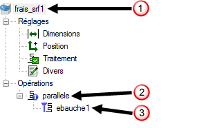 La boite de dialogue de propriétés de fraisage surfacique 3D liste les stratégies et les opérations dans l'arborescence. Les onglets affichés dans la boite de dialogue changent en fonction du niveau que vous avez sélectionnez dans l'arborescence.