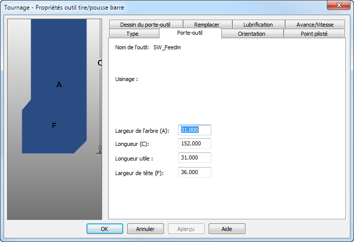 Longueur utile — Ceci est la longueur de l'outil qui dépasse du porte-outil s'il est simulé.