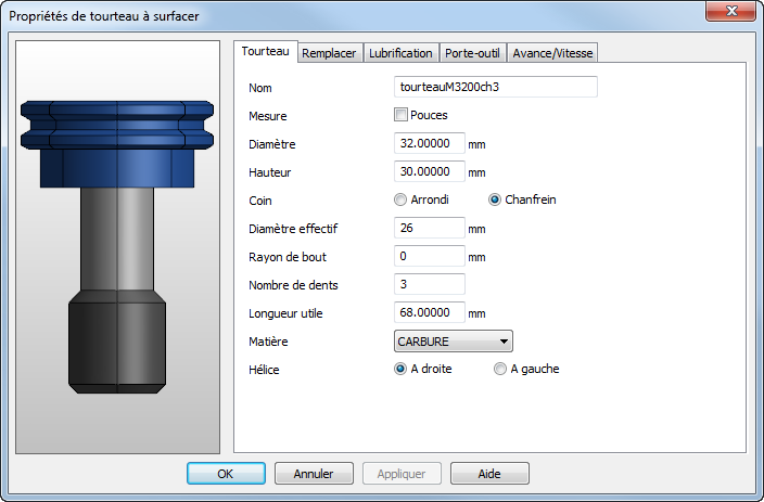 Définissez ce nouvel outil comme étant le remplacement pour la feature de surfaçage, puis utilisez-la pour usiner les features de chanfrein, en remplaçant les outils par défaut dans la liste des opérations.