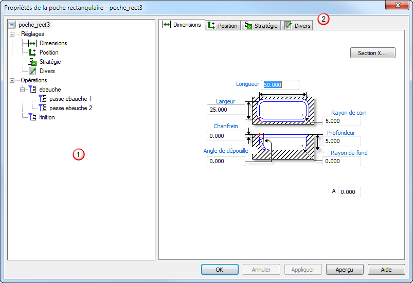 L'arborescence affiche une liste d'opérations et de passes pour la feature. Les onglets affichés dans la boite de dialogue changent en fonction de quel niveau est sélectionné dans l'arborescence.
