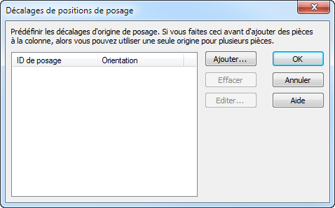 La boite de dialogue Décalages de positions de posage liste les ID de posage que vous avez créé.