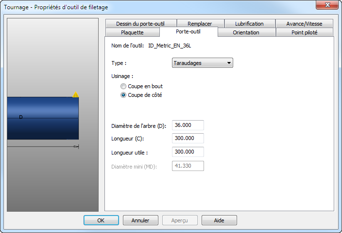 Longueur utile — Ceci est la longueur de l'outil qui dépasse du porte-outil s'il est simulé.