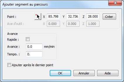 Cette boite de dialogue vous permet d'insérer un nouveau point avant le point actuellement sélectionné. Pour chaque point que vous voulez créer, entrez les coordonnées du nouveau point, spécifiez une avance ou sélectionnez l'option Rapide, entrez éventuellement une temporisation en secondes et cliquez sur le bouton Créer. Quand vous avez fini avec la création de points, cliquez sur OK.