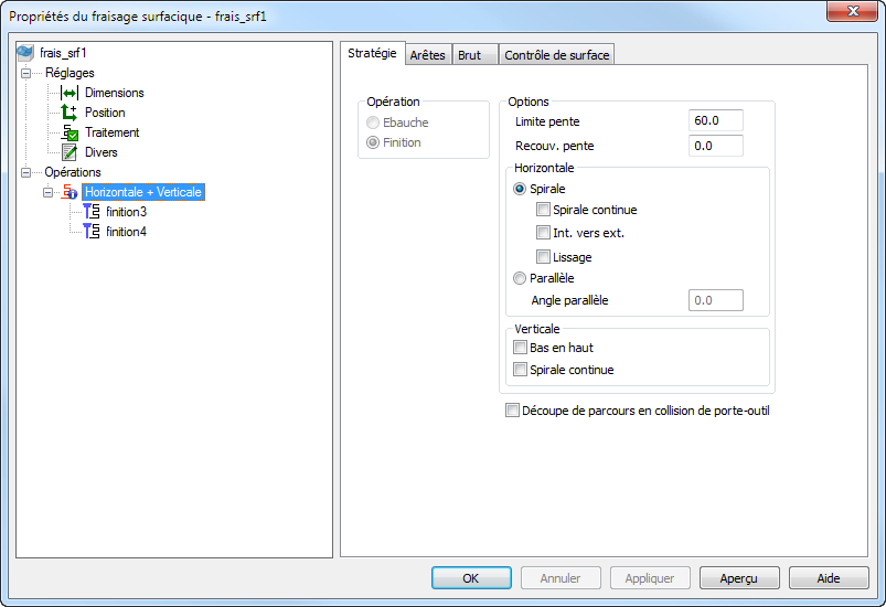 Limite pente — C'est l'angle qui sépare les régions horizontales et verticales. Les portions des surfaces avec une pente inférieure à cet angle sont usinées avec des parcours d'outils parallèles et les pentes plus raides sont usinées avec un parcours Tranche-Z.