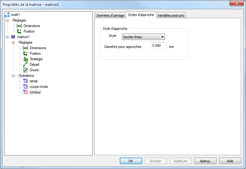 Vous pouvez utiliser l'onglet Style d'approche de la boite de dialogue de propriétés de feature d'électro-érosion pour éditer les mouvements d'approches de la feature d'électro-érosion.