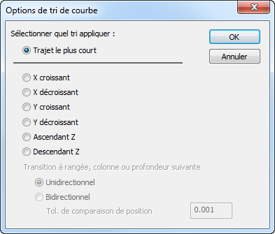 Pour afficher la boite de dialogue Options de tri de courbe, dans la boite de dialogue Tri ou Sélectionner les courbes de frontière, sélectionnez Tri manuel et cliquez sur Tri.