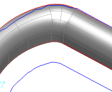 Dans l'exemple suivant, la frontière de pièce (rouge) est lisse, mais le décalage d'outil (bleu) est grossier. Diminuez la tolérance de décalage de frontière pour un décalage d'outil plus lisse :