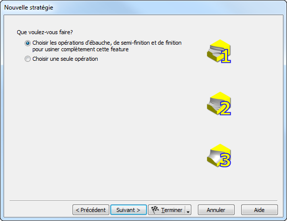 - Choisir les opérations d'ébauche, de semi-finition et de finition pour usiner complètement cette feature — Créez une feature de fraisage surfacique qui contient plusieurs opérations. Cela vous permet de créer les opérations d'ébauche, de semi-finition et de finition rapidement en utilisant l'assistant.