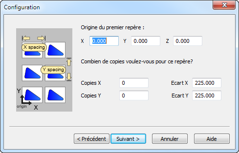 L'espacement X et l'espacement Y sont les espacements entre les pièces d'origine. Selon le post-processeur, ces nombres d'espacement ne devrait avoir aucun effet sur la pièce comme produite sur la machine. Ceci est contrôlé par l'ID de posage et comment l'ID de posage est utilisé pour localiser d'autres pièces relatives aux autres.
