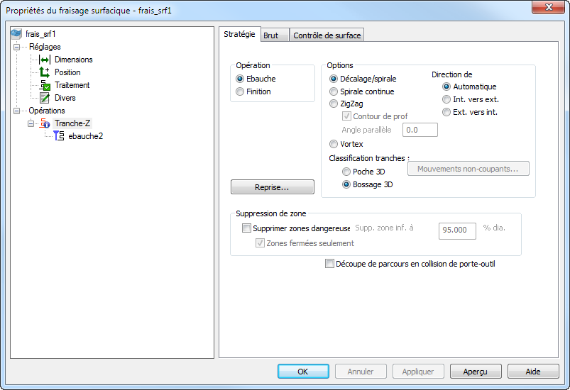 Reprise — Cliquez sur le bouton pour ouvrir la boite de dialogue Options de reprise d'ébauche Tranche-Z.