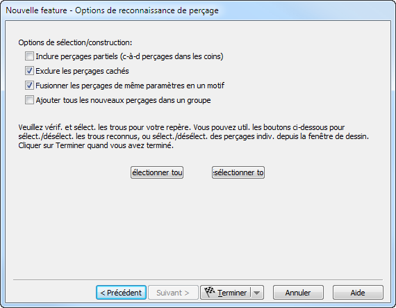 - Si vous voulez conserver tous les perçages reconnus, cliquez sur Sélectionner tout, puis sur Terminer.