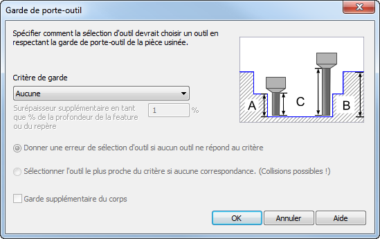 - Dans la liste Critère de garde, sélectionnez la garde que vous voulez entre le porte-outil et la pièce. Sélectionnez parmi :