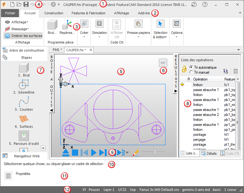 La barre de titre affiche le nom du fichier pièce, dans ce cas CALIPER.fm, et le type de repère de pièce entre parenthèses, dans ce cas (Fraisage). Quand vous avez des changements non-enregistrés dans votre fichier pièce, une astérisque (*) est affichée à côté de son nom.