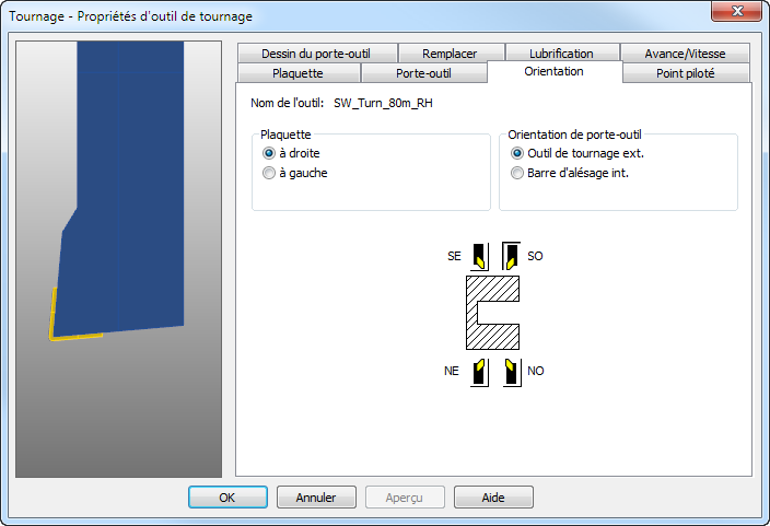 Dans l'onglet Orientation, vous pouvez définir l'orientation du porte-outil dans la machine et le côté de l'outil.