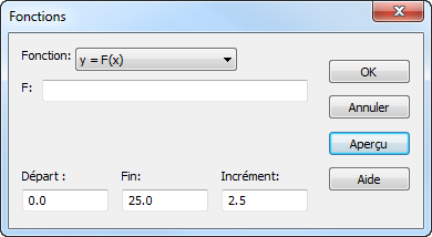 Dans la liste de Fonction, sélectionnez le type de fonction que vous voulez construire. Utilisez y = F(x) pour spécifier y comme étant une fonction de x et x = F(y) pour spécifier x comme étant une fonction de y.