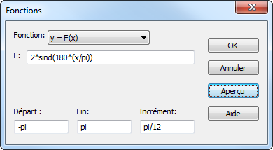 Aperçu — Ceci génère la courbe et l'affiche pour la vérification mais n'applique pas la fonction générée au dessin comme géométrie. Selon les points de départ et d'arrivée et l'incrément, l'image d'aperçu peut prendre du temps à être évaluée et construite.