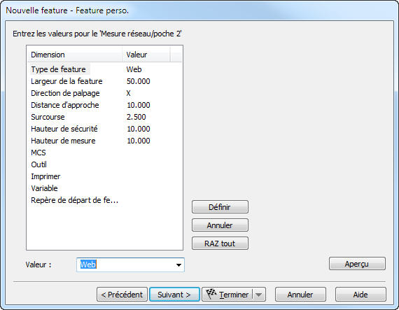 Largeur de la feature — Entrez ou choisissez la largeur du réseau ou de la poche. Cliquez sur Définir pour enregistrer.