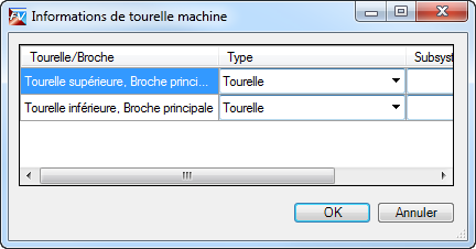 Utilisez la boite de dialogue Informations de tourelle machine pour spécifier les options de tourelle. Cette boite de dialogue est uniquement disponible pour les pièces multi-tourelles.
