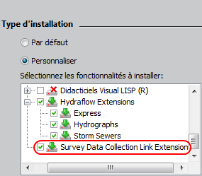 Pour installer Survey Data Collection Link Extension, vérifiez que l'option correspondante est sélectionnée. Dans le cas d'une installation standard, elle est sélectionnée par défaut.