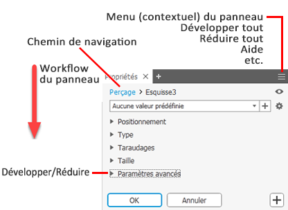 Ils flottent au-dessus de la zone graphique et apparaissent initialement dans l'angle supérieur gauche de cette dernière. Les panneaux peuvent être redimensionnés, déplacés au sein de l'écran ou vers un deuxième écran, ou combinés au navigateur Modèle. Ils sont constitués de sections développables et non plus d'onglets.