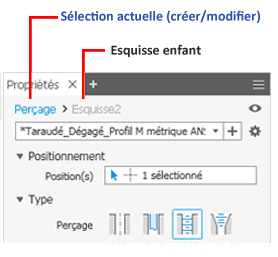 Le menu du panneau de propriétés contient des paramètres liés au contexte de création ou de modification actif. Par exemple, pour la commande Perçage, vous pouvez choisir de présélectionner automatiquement les points de centre et de partager automatiquement l'esquisse associée ou active si certains points de centre n'ont pas encore été utilisés, c'est-à-dire utilisés pour créer des perçages. Vous pouvez également choisir de limiter la sélection à l'aide d'une fenêtre aux points de centre uniquement. Les entrées du menu sont contextuelles et seules les options utilisées par la commande sont affichées.