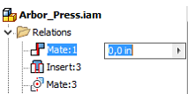 Relations affiche une liste séquentielle de toutes les liaisons et contraintes dans l'ensemble. Vous pouvez rapidement modifier ou mesurer la géométrie de contrainte en sélectionnant un élément dans le dossier Relations. L'option du menu du navigateur Modifier les valeurs dans le navigateur doit être activée.
