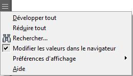 Le menu contextuel (accessible via un clic avec le bouton droit de la souris) permet d'effectuer différentes opérations sur la fonction, la relation ou le composant sélectionné dans le navigateur. Le nombre d'options disponibles dépend de la configuration du navigateur, ainsi que de l'élément sélectionné.